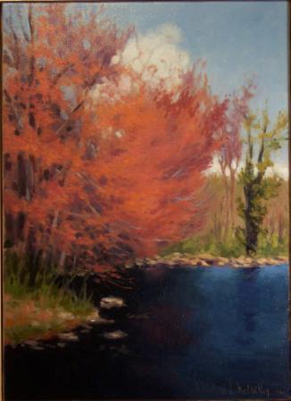 Oil on linen painting 18" x 24" of the small pond at Flanders by Marija P. McCarthy in April. Spring is especially splendid at Flanders and provided the inspiration for this painting: the pond full of winter's thaw, its water alive with new life, mirroring bursts of color below the bright blue sky and tufts of white clouds. Marija is a life long painter and educator, trained in her native country of Serbia, and at George Washington University in D.C. Having over thirty solo exhibits on five continents, her paintings are in collections of U.S. Congress, the national Museums of Belgrade and the New Britain Museum of American Art.